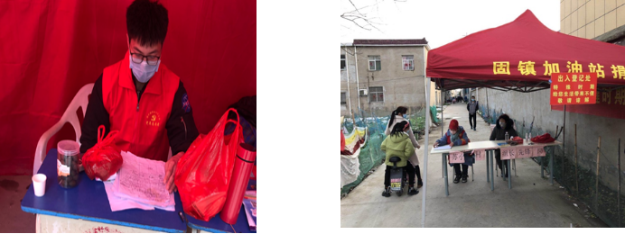 学院18级学子曾焕生来到村委会,在党员同志的领导下,在村口设关卡,为进出村民测量体温并登记外来人口信息。