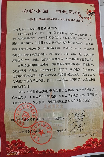 收到中共元氏县赵同乡委员会和元氏县赵同乡人民政府发来的感谢信,感谢数字媒体技术2004班学生王旭晴主动请缨参加村青年志愿服务队,为家乡打赢疫情防控阻击战贡献了青春力量。